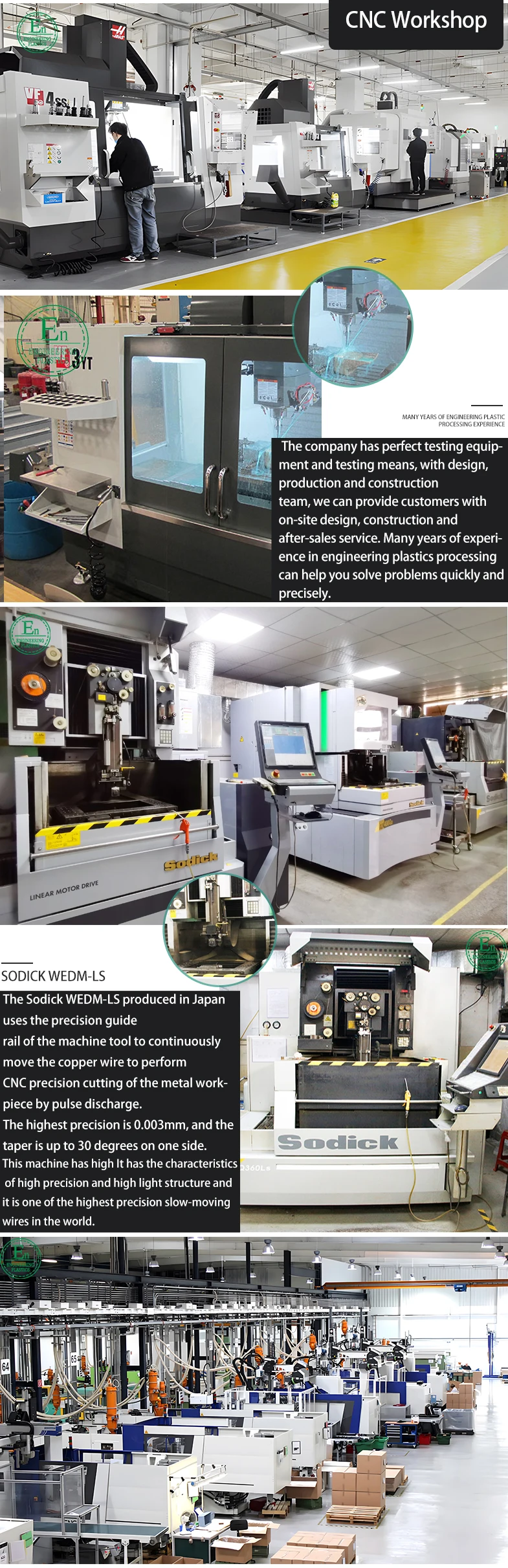 | Guangdong Engineering plastics company has OWM:Imported CNC equipment, EDM machines, Imported mirror wire cutting machines, High-speed precision engraving machines, Laser cutting machines, Sodick slow threading machines, Precision grinders, Plastic injection molding machines,Double color injection machines,etc |